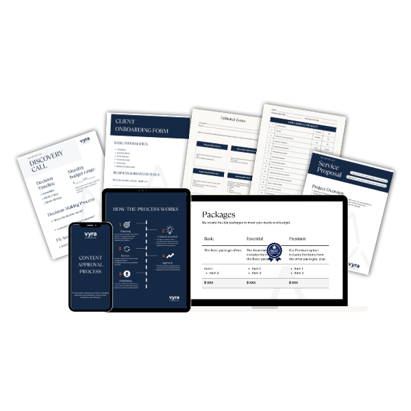 A complete system of templates and workflows used to onboard clients, manage approvals, define scope, and deliver content like a real agency — without chaos.